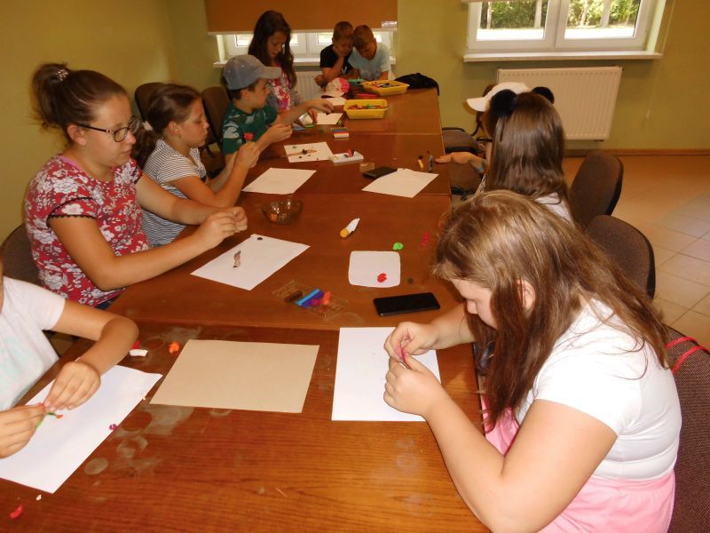 Zajęcia z dziećmi rozpoczęły się 1.07.2019 r. Od poniedziałku do piątku w godzinach od 11.00 do 15.00 dzieci miały możliwość uczestniczyć w zajęciach plastyczno-technicznych, sportowych w grach i zabawach ruchowych. Nie brakowało chętnych do gier planszowych i układania puzzli. Wiele radości dał dzieciom konkurs Mam Talent. Dużym powodzeniem cieszył się również plac zabaw i siłownia zewnętrzna.