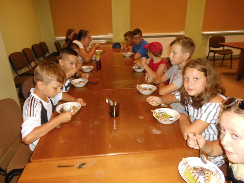 Nie mogło zabraknąć także pokazu żywieniowego i słodkiego poczęstunku. Uczestnicy zajęć mogli zjeść własnoręcznie zrobioną pizzę a na deser galaretkę z bitą śmietaną i owocami.