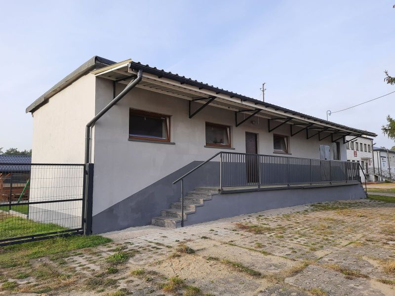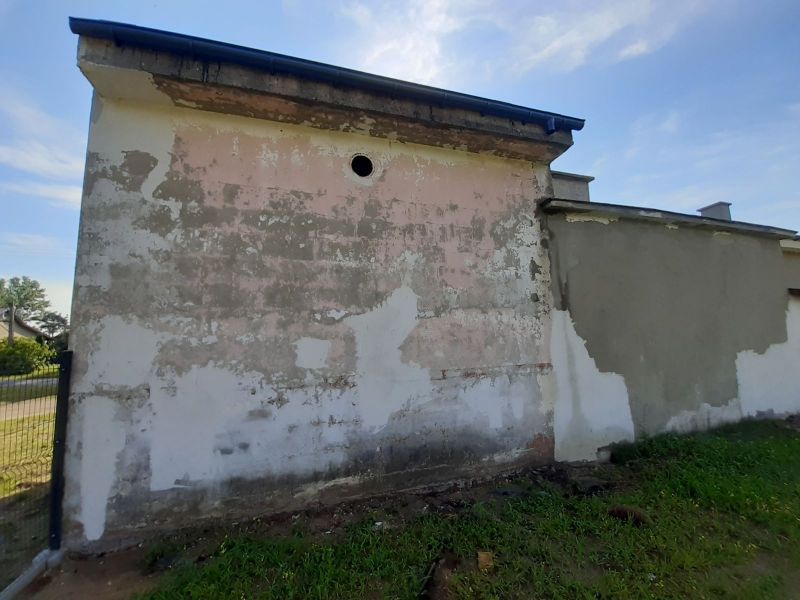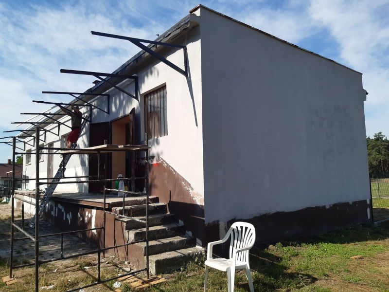 Równolegle do prac ogrodzeniowych prowadzono remont zewnętrzny budynku dawnej zlewni mleka. Ściany budynku zostały zaszpachlowane i wyrównane oraz pomalowane, wykonano nową barierkę oraz nawierzchnię przed wejściem do budynku, schody, a także daszek nad rampą i orynnowanie całego budynku. Prace wykonała firma Daria Grabowska, ul. A. Asnyka 3, 95-015 Głowno za kwotę: 26 000,00 zł brutto.
