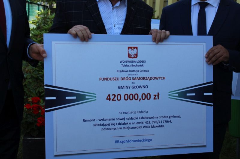 Gmina Głowno otrzymała 420 000,00 zł dofinansowania na inwestycję drogową w Woli Mąkolskiej. Samorządowcy z terenu powiatu zgierskiego otrzymali od Wicewojewody Łódzkiego – Karola Młynarczyka oraz Posła na Sejm RP – Marka Matuszewskiego symboliczne czeki, informujące o uzyskanym dofinansowaniu konkretnych inwestycji