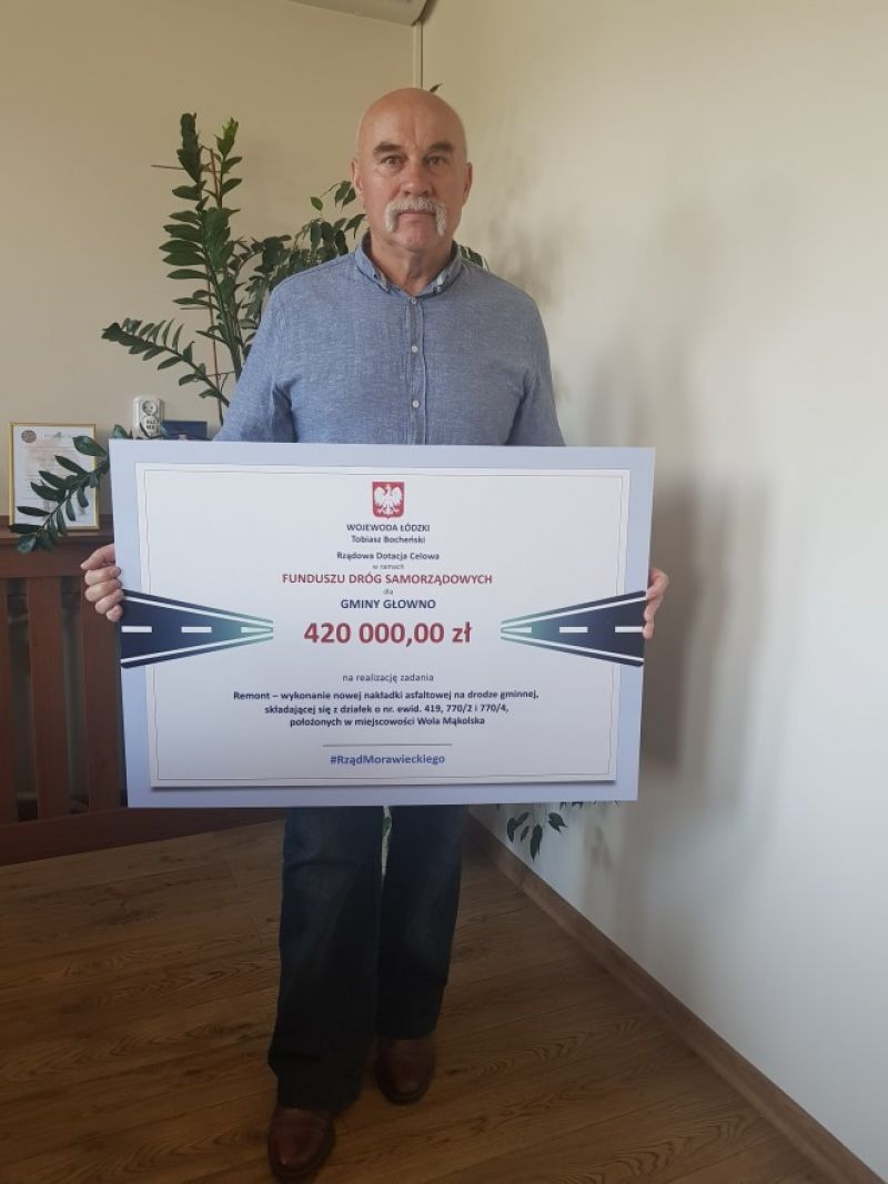Wójt Gminy Głowno otrzymał promesę o uzyskaniu dofinansowania w wysokości 420 000,00 zł, dzięki któremu w roku bieżącym zostanie wyremontowana droga w miejscowości Wola Mąkolska. Środki pochodzące z Funduszu Dróg Samorządowych stanowią 70% wartości całej inwestycji.