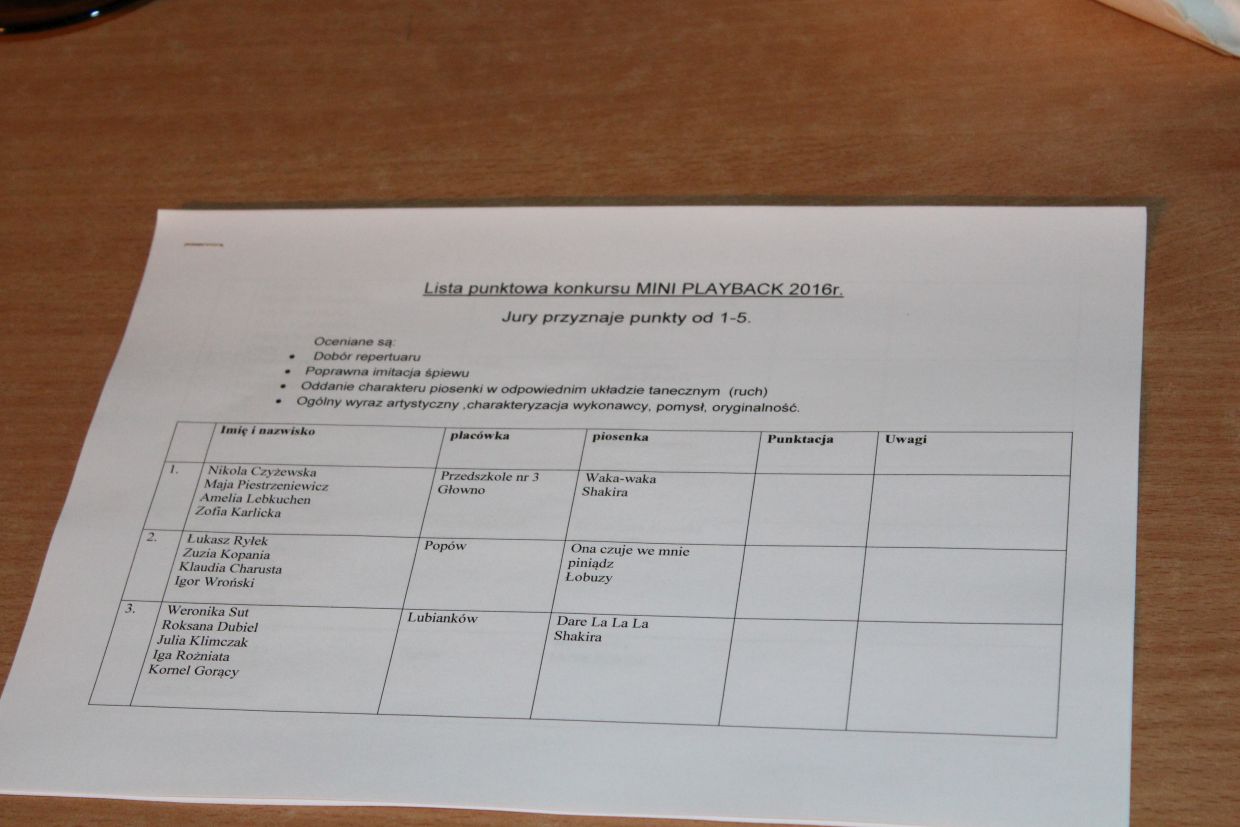 W dniu 8 czerwca 2016 roku w Zespole Szkół w Popowie Głowieńskim odbyła się VI edycja konkursu Mini Playback pod patronatem Wójta Gminy Głowno Pana Marka Jóźwiaka. Organizatorami imprezy były Panie: Joanna Kędziora, Jolanta Szeliga, Agnieszka Wołowiec – Olesińska oraz Pan Paweł Karlikowski. Jury stanowili przedstawiciele placówek biorących udział w zmaganiach (Przedszkola nr 3 oraz Osinkowo z Głowna, Lubiankowa, Mąkolic, Popowa Głowieńskiego, Piątku), Wójt Pan Marek Jóźwiak, Dyrektor ZS w Popowie Głowieńskim Pan Krzysztof Fortuna, Przewodnicząca Rady Rodziców Pani Małgorzata Wielemborek oraz przedstawiciel ZHP Pan Grzegorz Piórkowski. W czasie konkursu oceniany był dobór repertuaru, poprawna imitacja śpiewu, oddanie charakteru piosenki w odpowiednim układzie tanecznym, ogólny wyraz artystyczny, charakteryzacja wykonawcy, pomysł oraz oryginalność. Po występach, w czasie obrad jury, uczestnicy zmagań muzycznych udali się przed budynek szkoły, aby wypuścić balony napełnione helem, następnie mieli poczęstunek oraz zabawę taneczną poprowadzoną przez starszych kolegów z klasy II i III gimnazjum. Po długim wyczekiwaniu nadszedł czas na ogłoszenie wyników. Przedstawiają się one następująco: